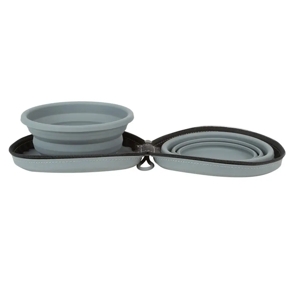 Collapsible Dual Bowls Holds 2 cups dry food and 18 fl. oz. Zippered pouch Great for travel Durable and safe silicone